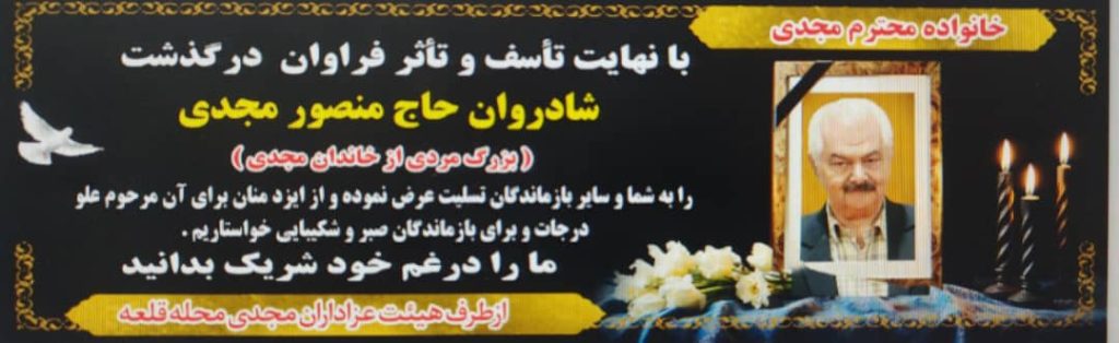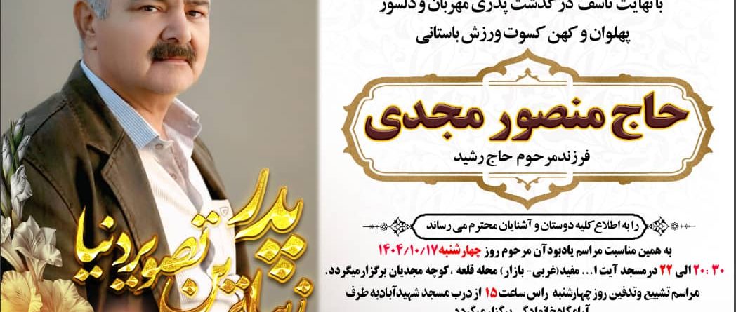 حاج منصور مجدی آسمانی شد امین شیخ نجدی2026-01-06T10:01:34+00:00 نویسنده امین شیخ نجدی امین شیخ نجدی فرزند حاج عبدالامیر شیخ نجدی نوه مرحوم حاج عبدالحسین شیخ نجدی دیدگاهتان را بنویسید لغو پاسخنشانی ایمیل شما منتشر نخواهد شد. بخشهای موردنیاز علامتگذاری شدهاند *دیدگاه * نام * ایمیل * وب سایت ذخیره نام، ایمیل و وبسایت من در مرورگر برای زمانی که دوباره دیدگاهی مینویسم. Δ